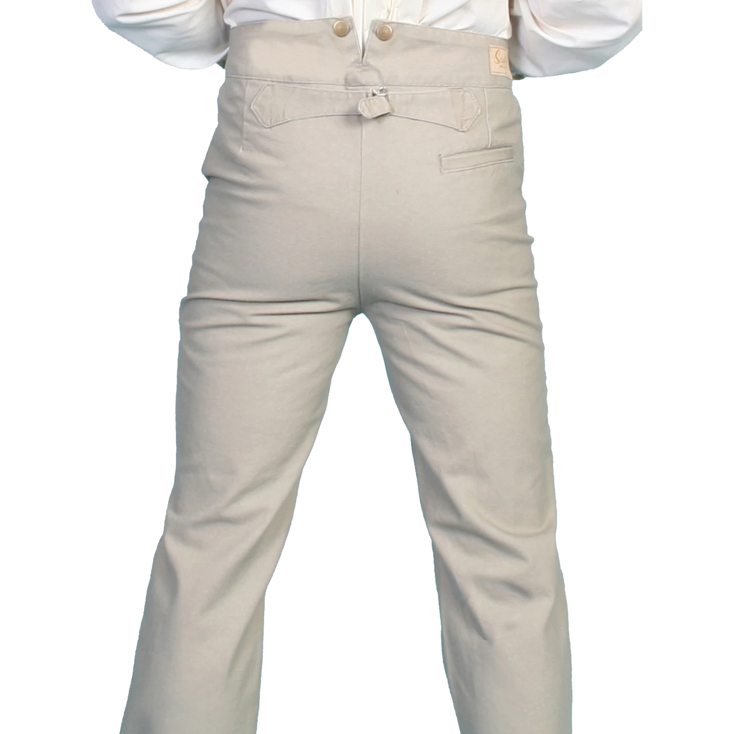 Durable 100% cotton canvas pant worn by both men and women. Features notched waistband with suspender buttons, adjustable rear belt and buckle, and a single right rear welt pocket. Front features a button fly, watch pocket and two riding pockets.