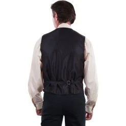 This paisley vest features no lapels, covered buttons and two welt pockets for your watch and chain. It has an adjustable back strap and is fully lined. Great dress vest for those special occasions.