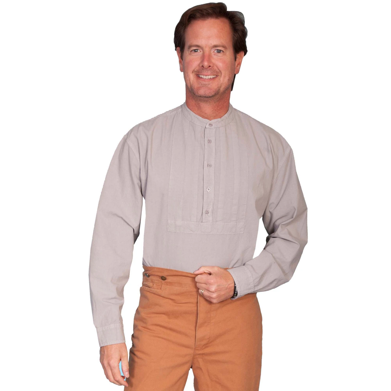 A favorite of gamblers and townfolk alike.This shirt features a band collar and finely pleated inset bib. This pullover style is gathered at the center back yoke for extra comfort.