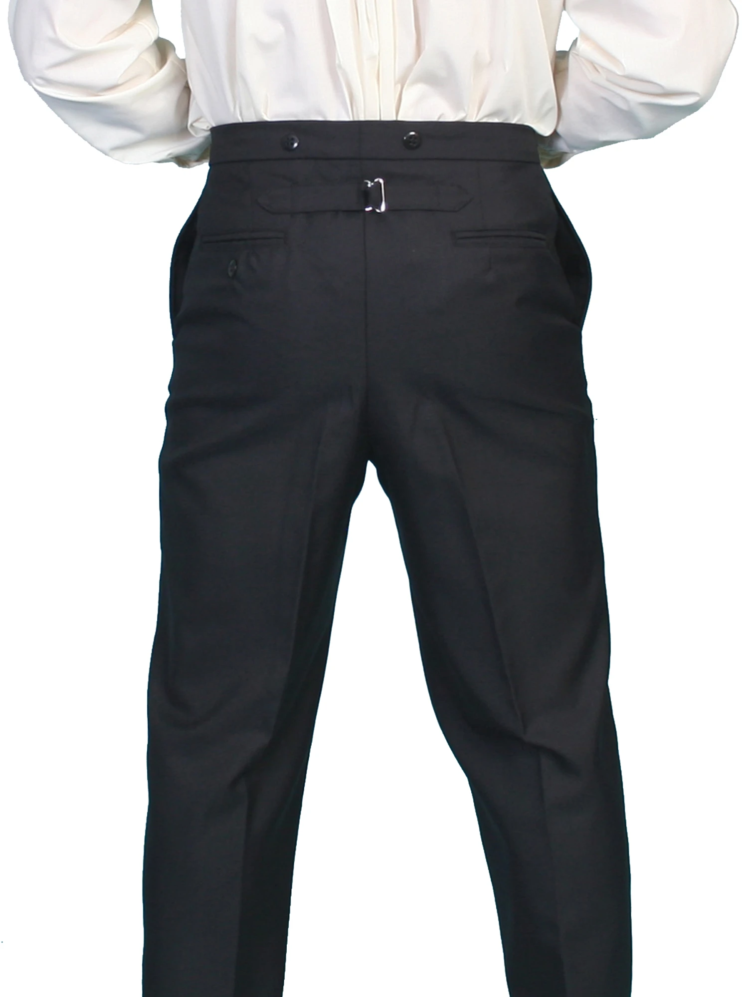 These pants are perfect for your special occasion. They feature a button fly, two side pockets, adjustable back strap and suspender buttons. These poly-wool bend pants are a nice comfortable weight, great for wear any time of year. Matching frock coat and town coat available.