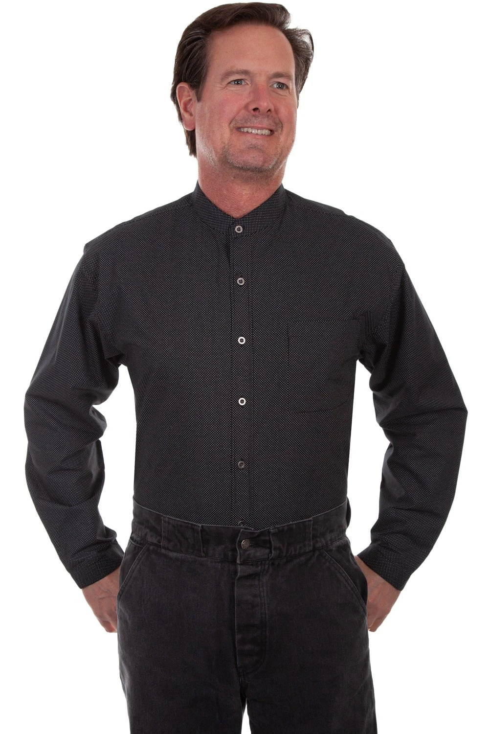 For the best leather accessories, leather goods, and fine western clothing, look no further than Scully Leather. These high quality goods are crafted from the finest materials available. This item features 100% cotton, pewter button front, and band collar. Enjoy Scully western style in this shirt.