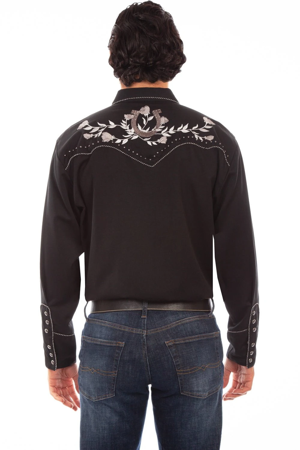 For the best leather accessories, leather goods, and fine western clothing, look no further than Scully Leather. These high quality goods are crafted from the finest materials available. This item features 65% polyester/35% rayon, grey embroidered horseshoe and roses, and studded horseshoe and studs. Enjoy Scully western style in this shirt.