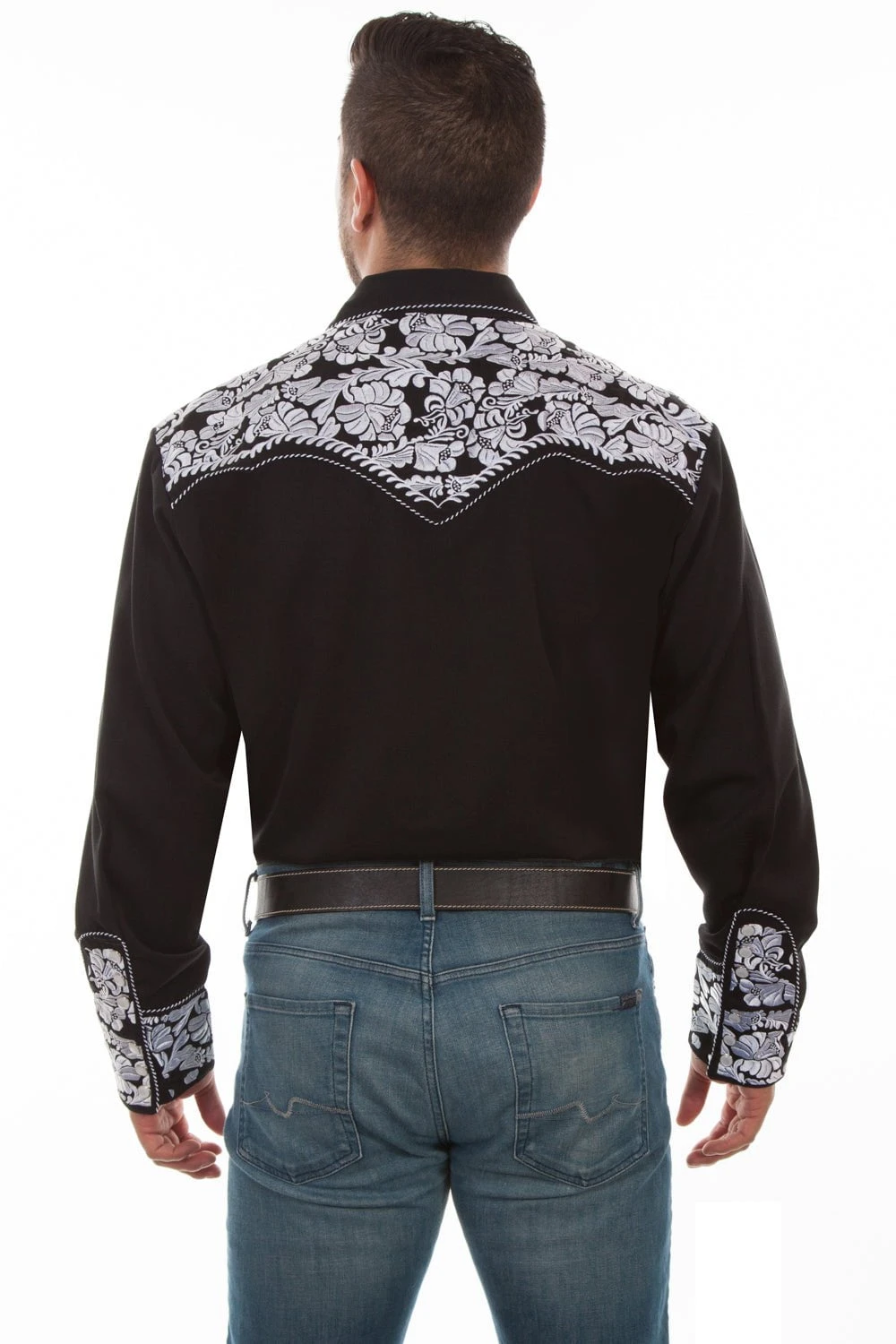 Scully Mens Black/White Polyester Floral Tooled L/S Shirt