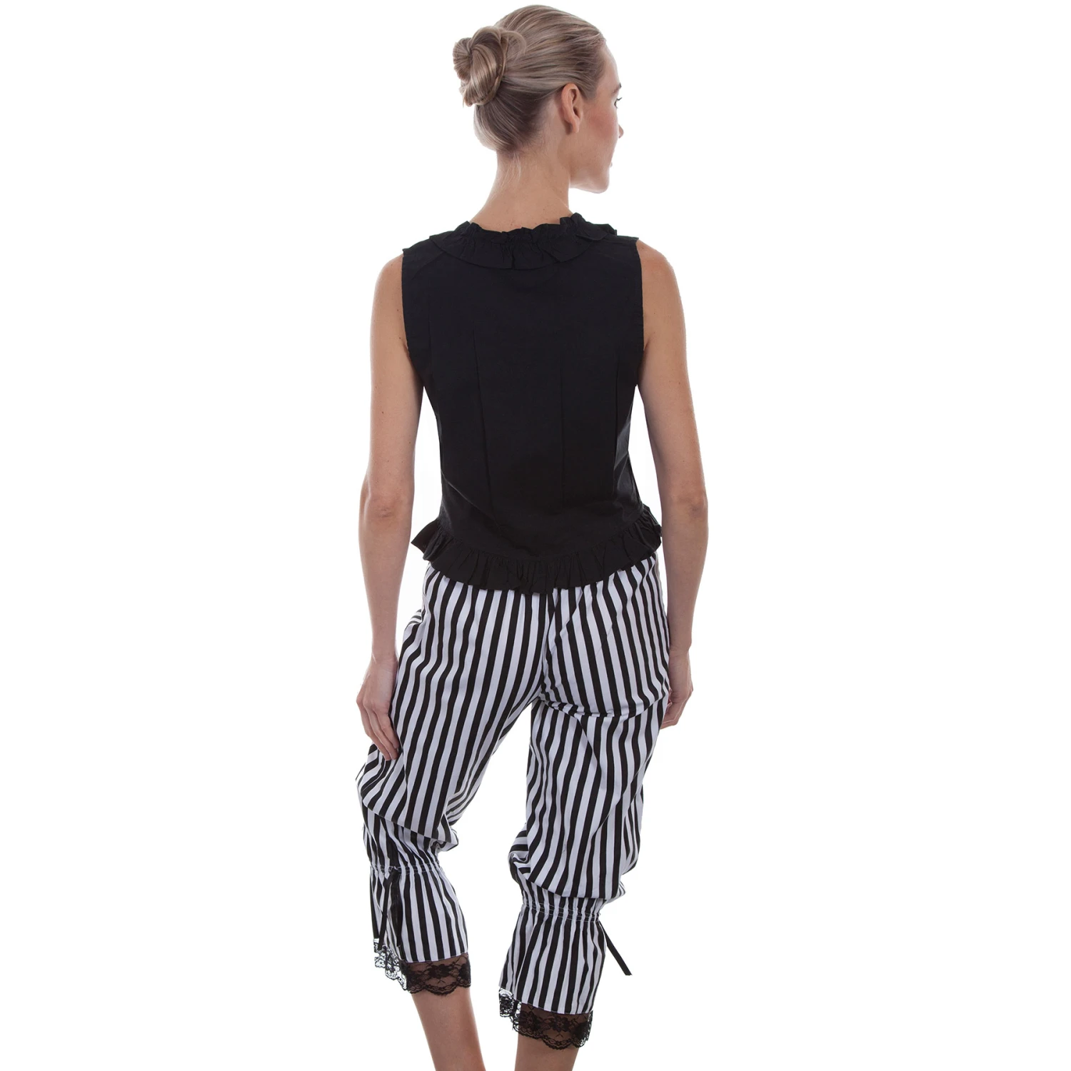 These pretty striped bloomers have a row of lace ruffels at the bottom. It has an elastic waist in the back and string tie in the front and on each leg at the knee.