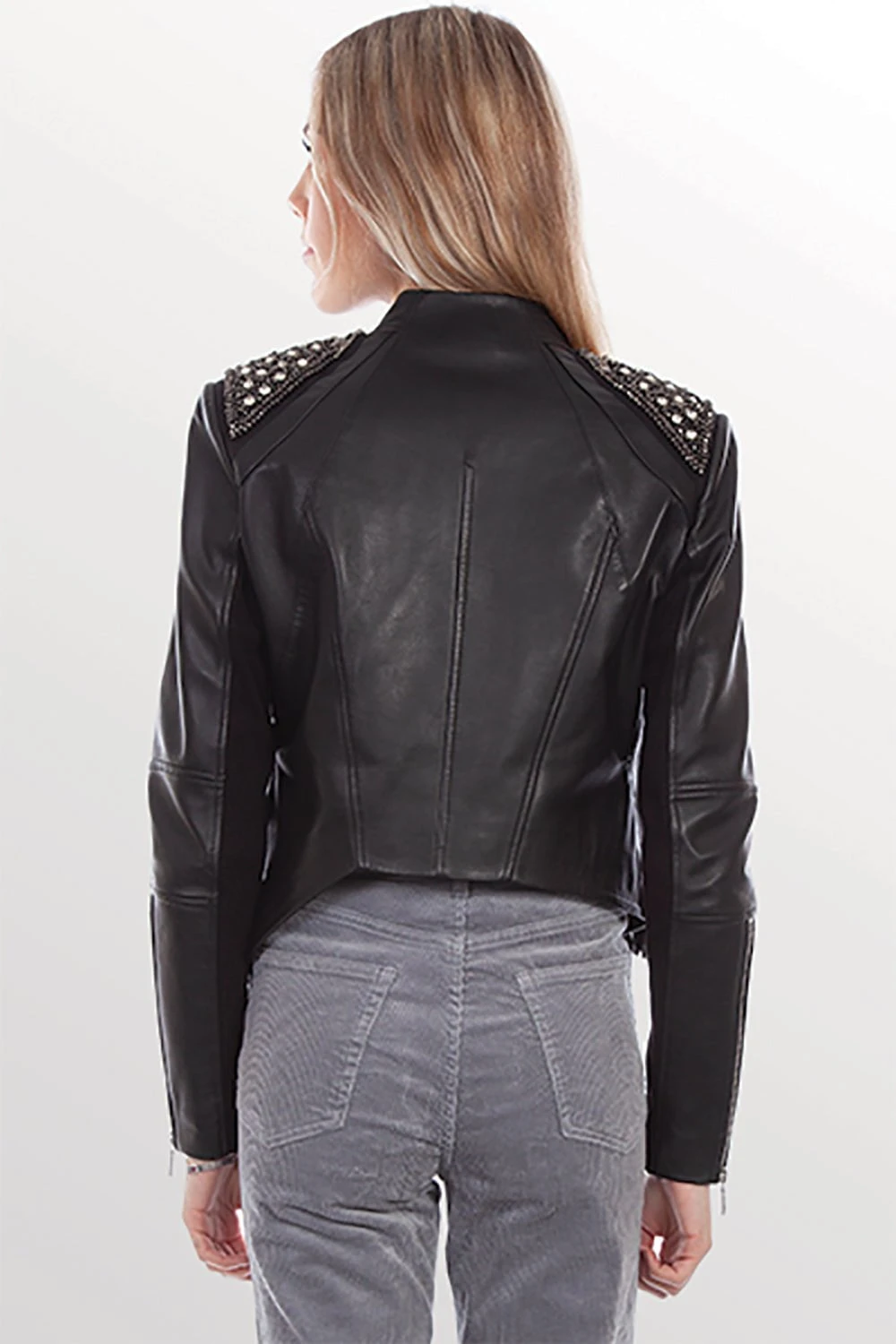 Scully Womens Black Lamb Leather Fringe Studded Jacket