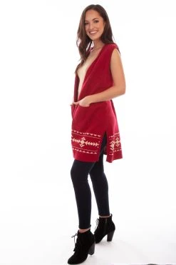 For the best leather accessories, leather goods, and fine western clothing, look no further than Scully Leather. These high quality goods are crafted from the finest materials available. This item features 100% cotton, sleeveless, and contrast ivory geometric pattern band. Enjoy a versatile layer with the cardigan-style sweater.